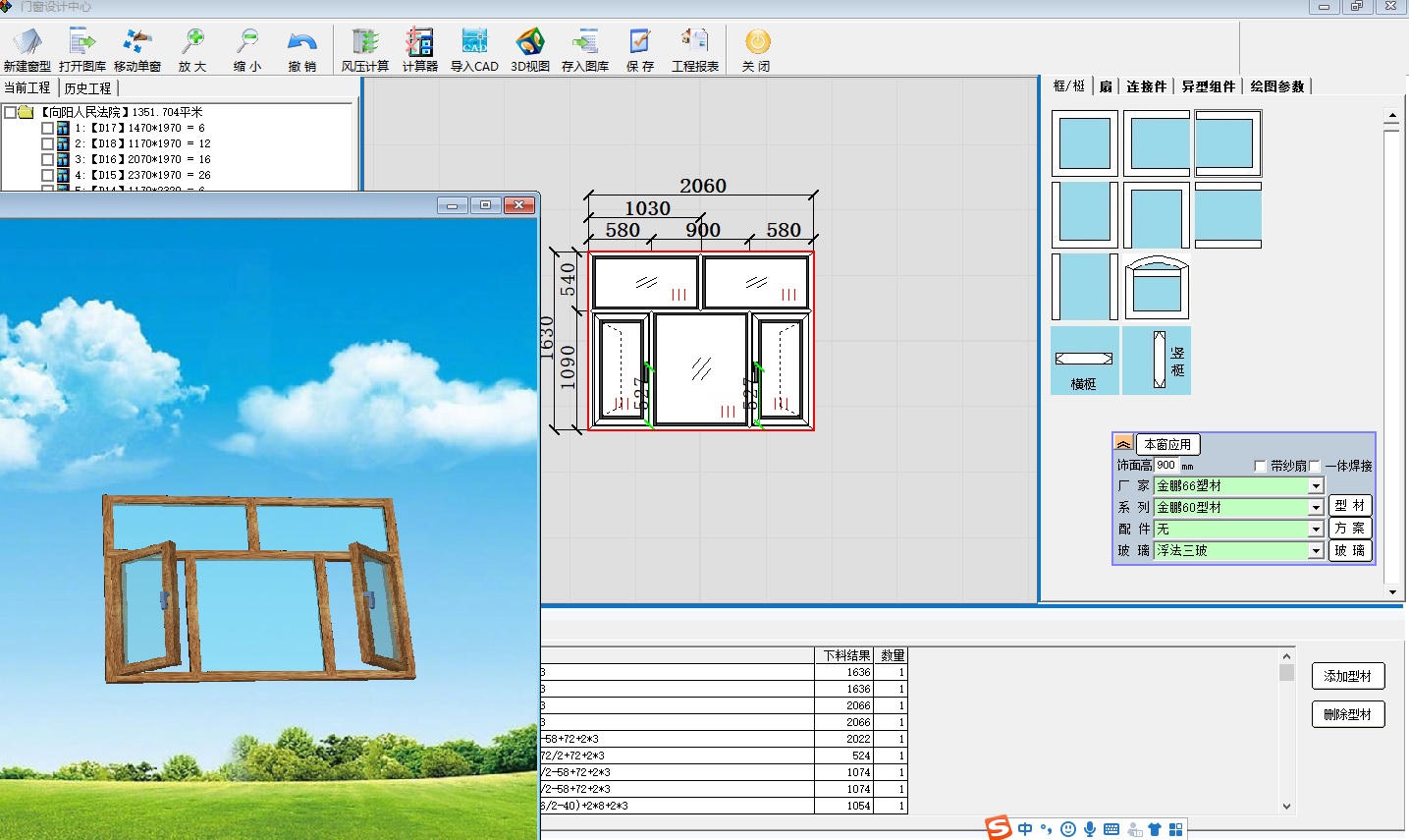 蓝科门窗设计管理软件。本软件分为两种版本-----标准版、网络版。蓝科门窗设计管理系统集成了工程设计、下料计算、材料优化、成本预算、销售管理、仓库管理、风压校核、型材截面参数计算等多项功能。该软件操作简单、界面友好,完全符合门窗行业的需求和使用。在使用过程中,您可以简单的去设计窗型,输入尺寸,修改测量参数,并可以对型材、五金、玻璃实现灵活选料,组合窗设计更为轻松,设计出的窗型为逼真的复线彩色图形,可以直接输出到Auto CAD系统中,以满足各种场景下用户对窗型设计的需要。工程设计完毕之后,您可以根据需要任意选择一种进行优化运算,优化时您可以设置系统自动调用仓库零料,产生的零料您可以随时入库,至此,系统已经为您生成了以后工作所需要的所有报表(工艺、备料、成本分析、以及为客户提供的快速、准确的多种报价表),报表采用EXCEL,您可以自由修改,报表反映了门窗企业经营、生产和管理活动中所需要的各种信息,提高了数据的准确性和工作效率。