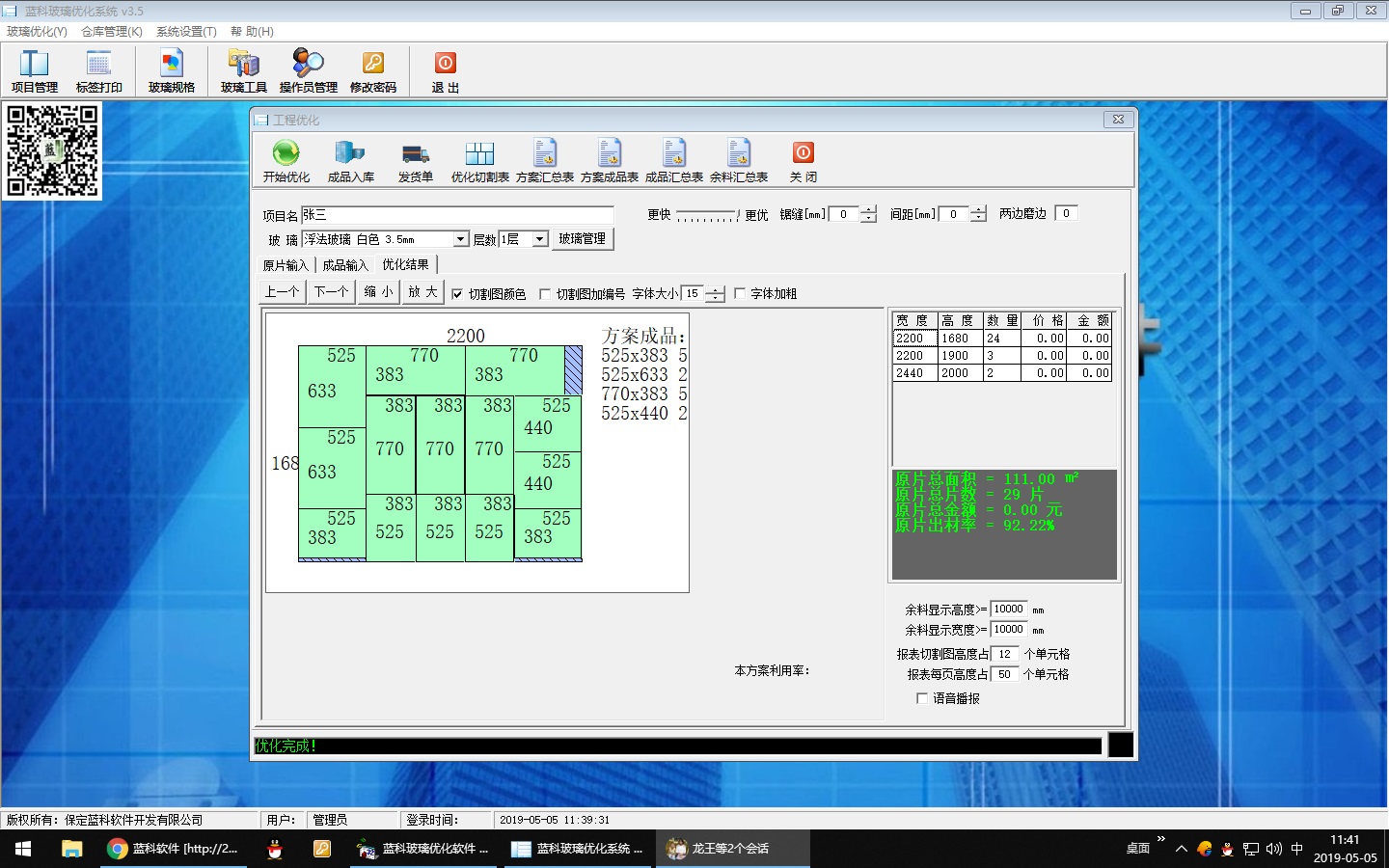 《蓝科玻璃优化软件》产品可以对玻璃板材进行切割优化运算,产生清晰明确的切割图形,并可打印出切割的余料,可利用零料,标签可直接方便快捷输出打印,降低您的玻璃板材采购成本,产品操作简单,输入方便快捷,可EXCEL导入导出数据,产品内核采用先进的数学模型和优化算法,优化利用率高,优化速度快。